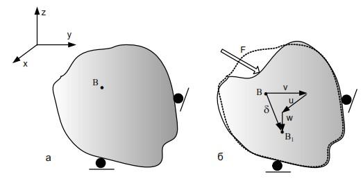 После приложения внешних сил, а также изменения температуры тело может изменить форму и размеры, а каждая его точка получит соответствующее перемещение. Точка В перейдет в новое положение В1 (рис. 4.1, б).