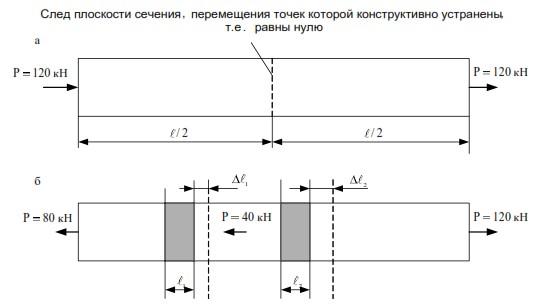 Рассмотрим стержень (рис. 4.2, а), растягиваемый силами Р. Среднее сечение с помощью некоторых конструктивных решений не смещается и остается плоским. Тогда одна половина стержня удлиняется на некоторую величину