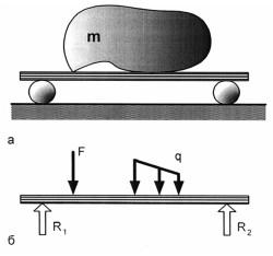 Поверхностные силы могут быть следствием воздействия другого соприкасающегося с ним тела – твердого, жидкого или газообразного. Поверхностные силы – это силы взаимодействия между соседними телами или между рассматриваемым элементом конструкции и окружающей средой. Например, на рис. 2.8, а показана некоторая система взаимодействующих тел – груз массой m транспортируется на платформе, которая, в свою очередь, через шаровые опоры взаимодействует с грунтовым основанием.