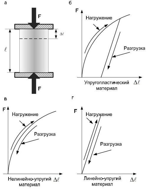 Рис. 1.10. Характерные диаграммы деформирования материалов: а) схема деформирования образца; б) упругопластический материал с нелинейно диаграммой деформирования; в) упругий материал с нелинейной диаграммой деформирования; г) линейно-упругий материал