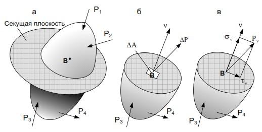 Через любую точку можно провести бесчисленное множество сечений. В каждом сечении получим свое полное напряжение. Совокупность напряжений по всем площадкам, проходящим через рассматриваемую точку, определяет напряженное состояние в точке.