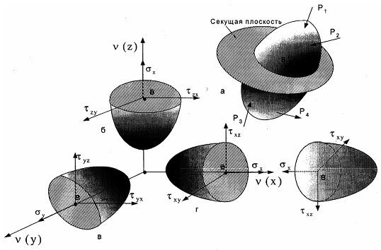 Рис. 3.7. Напряжения в четырех площадках в окрестности точки