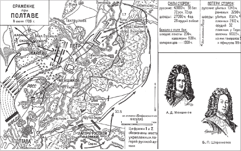 Король же шведский, двигаясь вглубь Украины, осадил Полтаву, где у русских были заготовлены массы провианта, так что овладеть этими запасами для Карла было очень важно. 27 июня 1709 г. произошла знаменитая Полтавская битва, в которой русские одержали решительную победу над шведами. Сражение продолжалось три-четыре часа, к полудню «непобедимые доселе господа шведы хребет свой показали» (по выражению Петра). За беглецами послали погоню, и 30 июня русские захватили в плен 14 тысяч шведских воинов со всей артиллерией и обозами.