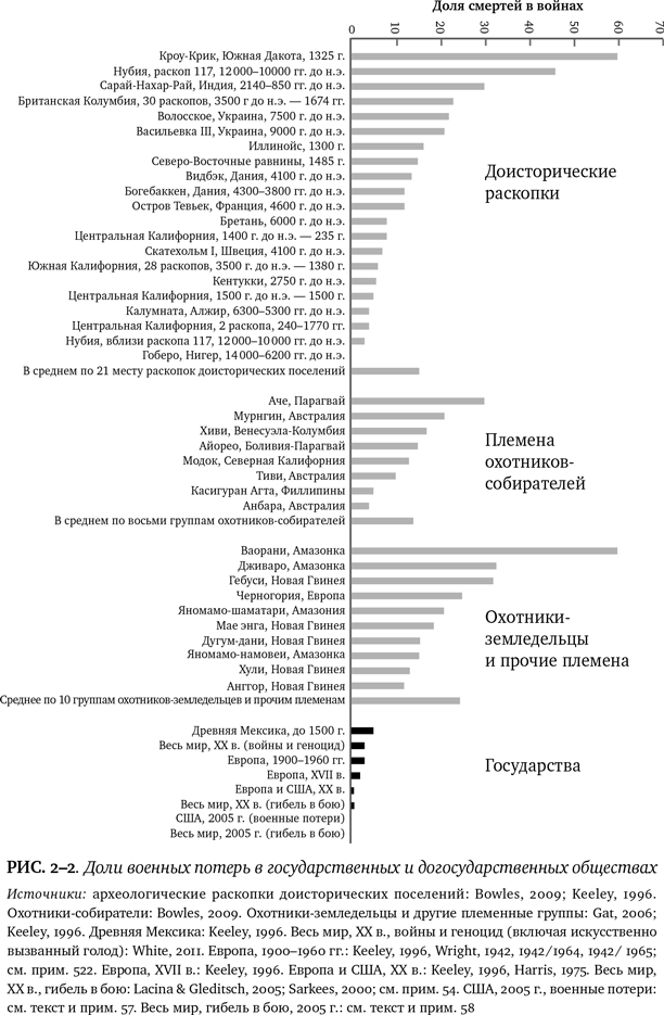 Только в последние 15 лет такие свободные от своекорыстных политических интересов ученые, как Лоуренс Кили, Стивен Леблан, Азар Гат и Йохан ван дер Деннен, начали систематический сбор данных, касающихся частоты и разрушительности военных действий догосударственных народов. Реальные цифры убитых в племенных войнах показывают, что безобидность таких конфликтов весьма условна. Во-первых, любая стычка может перерасти в побоище, усеивающее поле битвы мертвыми телами. Во-вторых, когда группы из нескольких десятков мужчин конфликтуют на регулярной основе, даже одна-две жертвы за одно столкновение повышают долю насильственных смертей, которая и так высока по любым стандартам.