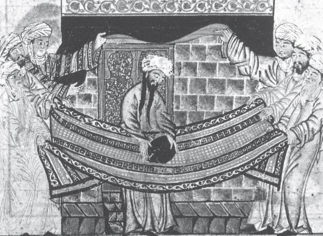 Неизвестный автор. Исламский пророк Мухаммед решает спор о том, чтобы установить черный камень на место в аль-Каабе. Иллюстрация к книге Рашида ад-Дина «Джами ат-Таварих». 1315 г. Библиотека Эдинбургского университета. Эдинбург, Шотландия