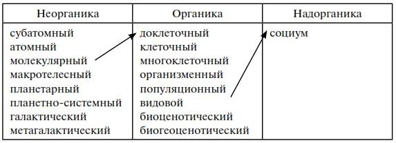 Материя не хаотична; имеет разветвленное внутреннее строение. Материя «вообще» — высочайшего порядка абстракция. В действительности она представлена естественной иерархией, компонентами, фрагментами которой выступают качественно несводимые друг к другу системные уровни. Богатство материальных форм исчерпывают ареалы микро-, макро-, мегамира, связанные каузально. Естественная иерархия материальных систем передается известной картиной уровней организации