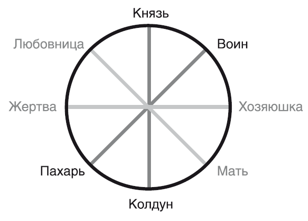 «Совмещение и разделение гражданской и духовной власти происходило в разных географических локациях в разные исторические моменты. В дореспубликанском Риме, например, цари были одновременно понтификами (верховными жрецами). В Древнем Египте фараоны тоже бывали по совместительству верховными жрецами (обычно Амона). В общем, в развитых языческих системах вождь и жрец – это две стороны одной медали (или два конца одной оси)»[6]. То есть когда мы говорим о самых первых архетипах, то вправе смешивать образы шамана и вождя (Колдуна и Князя в Колесе Сварога; Мага и Правителя в системе Пирсон-Марр (PMAI)). Впоследствии, как мы увидим, по мере усложнения и структуры общества, и человеческой психики эти два персонажа разводятся до противоположности, превращаясь в две крайности на одной оси.