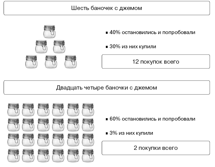 Шина Айенгар и Марк Леппер провели эксперимент с выбором «лишних» вариантов в реальных условиях. Покупателям предлагали выбрать и приобрести баночку джема. В первом случае на подносе было 6 баночек, во втором – 24. Большее количество баночек привлекало больше внимания. Но количество покупок было в разы выше в ситуации с меньшим выбором.