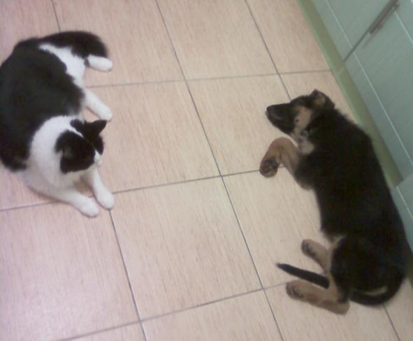 Конечно, Тобик мог лаять на кота, и даже мог его укусить. Но пес был очень добрым и компанейским, а поэтому не хотел ни с кем ссориться. Позже, когда Тобик подрос, он уже не сидел тихо в углу, а смело шел навстречу Тишке и даже ставил лапу коту на спину — в знак дружбы и равенства.