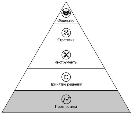 - В результате новых стратегий, разработанных с учетом преимуществ ИИ, мы встанем перед фактом его влияния на общество. Наш выбор будет зависеть от потребностей и предпочтений и наверняка в разных странах и культурах окажется разным. Мы разделили книгу на пять частей в соответствии с уровнями влияния ИИ и от основы пирамиды — прогнозов — начнем подниматься выше: прогностика, принятие решений, инструменты, стратегия и общество.