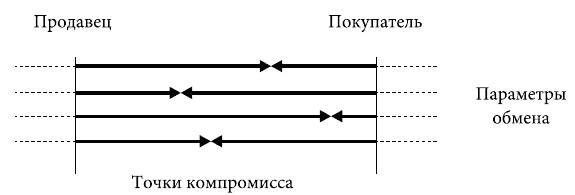 Иными словами, в торге почти всегда присутствует множество параметров, несколько точек равновесия и связанных с ними интересов,то есть не один, а несколько континуумов (см. рис. 1.2). И по отдельным параметрам для участника обмена возможно отступление даже за границу выгодности сделки. Смысл же рыночного торга, или переговоров, заключается в том, чтобы, уступив на одном направлении, продвинуться на другом. Например, в качестве разменных альтернативмогут выступать ценовая скидка и отсрочка платежа[7]; объём поставок ходового товара и расширение товарного ассортимента; выставление на продажу нового товара и величина маркетингового бюджета; размер бонусных платежей и место на магазинной полке. Во всех этих случаях речь идёт о количественных параметрах, которые автоматически не связаны между собой, но увязываются сторонами обмена в виде нормируемых пропорций. Например, ты должен сразу же предоставить скидку в размере Х% или позднее заплатить бонус за приращение объема продаж в размере Y%. И в процессе торга стороны вынуждены приходить к комплексным соглашениям по поводу этих связанных или взаимозаменяемых параметров [Келли 2008].