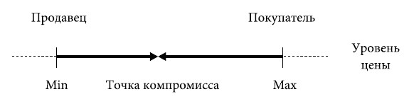 Как заключается сделка между продавцом и покупателем, каждый из которых преследует собственные экономические интересы и стремится к их максимально полному удовлетворению? Она становится возможной благодаря компромиссу,когда стороны вынуждены отказаться от максимально полной реализации своего интереса для того, чтобы он был реализован в принципе. Этот компромисс достигается в немалой степени в процессе торга, в рамках которого контрагенты пытаются предложить (или навязать) друг другу собственное понимание эффективных и справедливых условий обмена. Исходная модель торга может быть представлена в виде континуумас противоположно направленными интересами, а точка, в которой достигается соглашение сторон, определяется их относительной договорной способностью как непосредственным выражением рыночной власти, или способностью создать для себя лучшие условия обмена, заставив партнёра пойти на уступки, не отказываясь от обмена. Существуют также границы континуума, за которые участники заключаемого контракта отступать не готовы, своего рода край: за его пределами обмен перестаёт быть выгодным по представлению одной из сторон, и она готова от него отказаться. Таким образом, в первом приближении торг выглядит как лобовое столкновение сторон, преследующих сходный интерес и борющихся до тех пор, пока одна из них (доминируемая) не достигнет последней черты, за которую она уже не готова более отступать, а другая (доминирующая) не исчерпает свою способность к давлению (см. рис. 1.1).