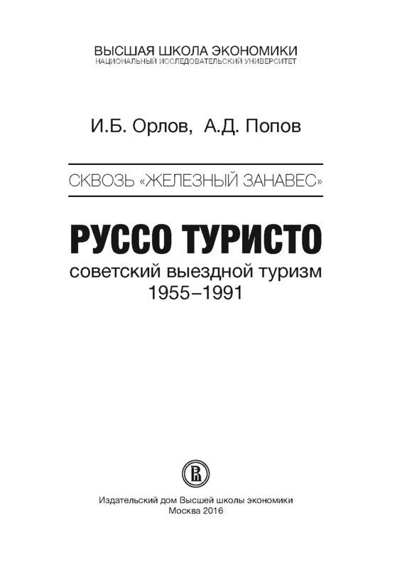 О-66 Орлов И. Б. Сквозь «железный занавес». Руссо туристо: советский выездной туризм в 1955–1991 годах [Текст] / Орлов И. Б., Попов А. Д. ; Нац. исслед. ун-т — Высшая школа экономики. — М. : Изд. дом Высшей школы экономики, 2016.