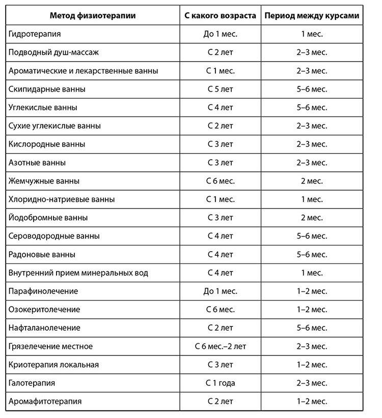 • строгое соблюдение возрастных сроков назначения физических факторов и периода между курсами физиотерапии (табл. 4).