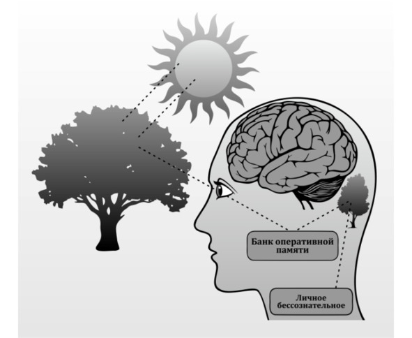 Так вот, получая электросигнал от внешних объектов и событий, наш мозг создает визуальный ряд, используя шаблоны из наших хранилищ памяти с учетом наших личных возможностей и наших психических запретов. Мы нагружаем потоки первичной информации проекциями из нашего личного бессознательного.