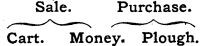77. Convenience of Money. With the aid of money all the difficulties of barter disappear; for money consists of some commodity which all people in the country are willing to receive in exchange, and which can be divided into quantities of any amount. Almost any commodity might be used as money in the absence of a better material. In agricultural countries corn was so used in former times. Every farmer had a stock of corn in his own granary, and if he wanted to buy a horse or cart, he took so many sacks of corn to his neighbour's granary in exchange. Now suppose that, with corn as money, a farmer wanted to part with a cart and get a plough instead; he need not inquire until he finds a person willing to receive a cart, and give a plough in exchange. It is sufficient if he find one farmer who will receive a cart and give corn, and any other farmer who will give a plough and receive corn. No difficulty arises, too, if the cart or plough are not of equal value; for if the cart be the more valuable, then the farmer finally gets for it the plough together with enough corn to make up the difference. Money thus acts as a medium of exchange; it is a go-between, or third term, and it facilitates exchange by dividing the act of barter into two acts, in this way—