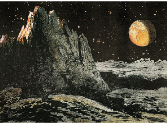 Хромолитография изображает лунный пейзаж на закате. 1984. Из книги Агнес Гиберн «Солнце, Луна и звезды». Великобритания, Лондон