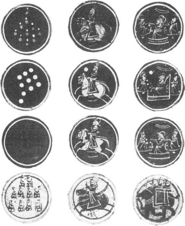 Неполные серии древних раскрашенных игральных карт, подробное описание которых у нас отсутствует, представляют большой интерес своим необычным оживлением почестей. Вишну изображается на белой лошади, на черном слоне в яркой попоне, на золотом льве и на пегом верблюде.