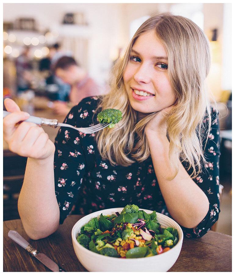 4 Питание, богатое зеленью, фруктами и овощами, обеспечивает отличное пищеварение за счет большого количества клетчатки, гарантирует вашим костям силу и здоровье (в зеленолистных овощах и семечках много кальция), свежий запах изо рта, здоровый уровень холестерина в крови (растительное питание способствует нормализации холестерина), чистую здоровую кожу лица и чистые носовые пазухи (попробуйте ограничить себя в молочных продуктах, и вы заметите, что стали простужаться гораздо реже).
