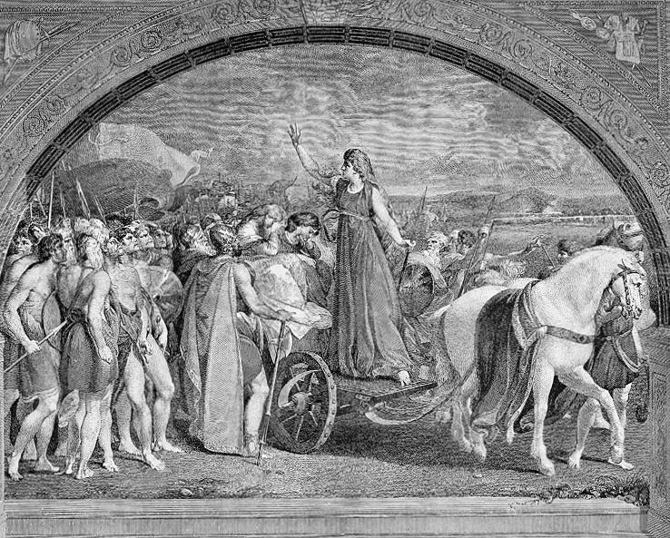 Но вообще-то интерес к Боудикке пробудился еще во второй половине ХVI века, в правление Елизаветы I, дочери Генриха VIII и несчастной Анны Болейн[20]. Энергичной Елизавете, которую следовало бы называть не «доброй королевой Бесс», а «сильной королевой Бесс», весьма импонировал образ древней британской воительницы. А то, что Боудикка выступала против римлян, приобрело особое значение после разрыва Генриха VIII с Римской католической церковью. Но после смерти Елизаветы английских Тюдоров сменили на троне шотландские Стюарты, которым Боудикка была чужда, и потому о ней снова забыли.