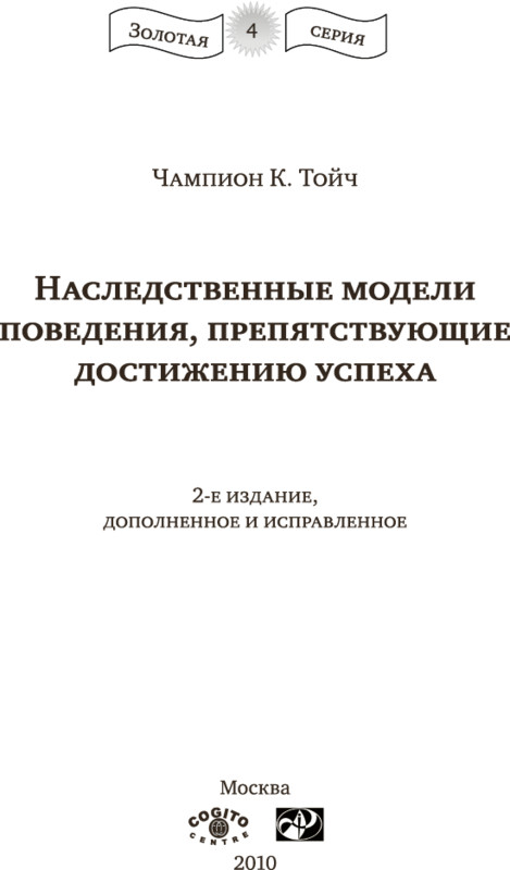 Книга, которую вы держите в руках, создана на основе стенограммы семинара Ч. Тойча «Наследственные и приобретенные модели поведения, препятствующие достижению успеха». Семинар был организован МИЦЧ «СанРэй», совместно с консультативным центром «Свет Джоэл» и международным просветительским центром «Познание», в г. Москве с 16 по 18 мая 2003 года в честь 10-летнего юбилея сотрудничества ATIM и МИЦЧ «СанРэй». Подготовку текста к публикации осуществил А.П. Наминач. При работе с текстом сокращению подверглись организационные сообщения организаторов и участников семинара.