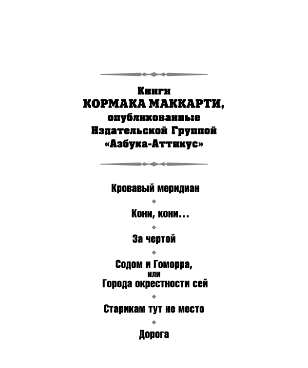 Кормак Маккарти — современный американский классик главного калибра, лауреат Макартуровской стипендии «За гениальность», мастер сложных переживаний и нестандартного синтаксиса, хорошо известный нашему читателю романами «Старикам тут не место» (фильм братьев Коэн по этой книге получил четыре «Оскара»), «Дорога» (получил Пулицеровскую премию и также был экранизирован) и «Кровавый меридиан» («своего рода смесь Дантова „Ада“, „Илиады“ и „Моби Дика“», по выражению Букеровского лауреата Джона Бэнвилла).