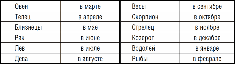 Итак, Солнце в своем кажущемся годовом движении обходит круг Зодиака в течение года, подобно тому как часовая стрелка обходит окружность циферблата в продолжение дня, а знаки Зодиака на великих мировых часах заменяют собой цифры наших часовых циферблатов. Как мы уже сказали, Солнце проходит каждый из знаков Зодиака в течение месяца, а именно: