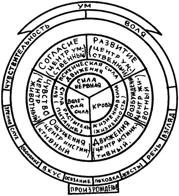 Для того чтобы составить понятие о физиологии планетной системы, мы должны представить себе, что все нервные центры движутся, так что, например, инстинктивный центр приходит в определенный момент в такое положение, что оказывается в связи с рукой; через некоторое время он уступит свое место анимическому центру, и так далее.