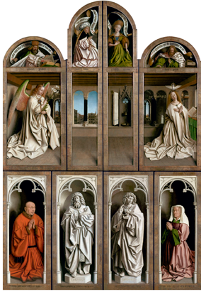 93 Мандер. С. 44, 45. Двухуровневая конструкция алтаря, в принципе аналогичная устройству оконных ставней, какие мы видим в нидерландских интерьерах того времени, оправданна технически: тяжесть створок распределяется на каркасе средней части алтаря по независимым друг от друга точкам креплений, что обеспечивает последним бóльшую прочность и упрощает ремонт алтаря. Такое устройство позволяло по-разному комбинировать открытые и закрытые части в зависимости от литургических требований, от исполняемых треб или от пожеланий посетителей, плативших за осмотр алтаря. Верхний ярус мог быть весь закрыт, весь открыт или же открыт частично, так что рядом с Богом Отцом оказывались прародители; так же и нижний ярус мог быть и закрыт, и открыт либо открыт частично, так что сцена поклонения агнцу оказывалась между изваяниями святых Иоаннов.