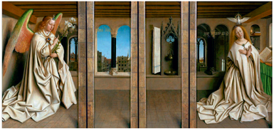 Готическая церковная архитектура мало приспособлена для украшения фресками — в ней слишком мало глухих стен. Если в итальянском искусстве параллелью к алтарным картинам являлись стенные росписи, то для нидерландской станковой живописи существенна иная параллель: нидерландские мастера не знали равных в искусстве иллюстрирования рукописных часословов — предмета гордости французской и бургундской знати [5]. Раскрывавшиеся, как двустворчатые складни, эти книжки с драгоценными оконцами-миниатюрами дарили своим владельцам ни с чем не сравнимое интимное удовольствие разглядывания сцен из Священной истории, деяний реальных или вымышленных героев или же трудов и дней человеческих под покровительством различных планет. «Они хранятся всегда в тайнике, их заботливо оберегают от чужих рук, они скрыты под толстым, накрепко защелкнутым переплетом. И расписаны они всегда для одного определенного лица, они носят его герб и его девиз, они служат его досугу и его молитвенному настроению. 〈...〉 Интимному назначению миниатюры, естественно, отвечает и самый характер ее рассказа: отсутствие яркого определенного действия и замена его настроением, созерцательным существованием — stilleven — вместо драматического повествования. 〈...〉 Погруженный в чтение, заказчик мерно перелистывает книгу; вот он поднимает голову от текста, слегка утомленный узорными буквами, и перед его глазами проносятся неясные образы прочитанного или пережитого, обрывки воспоминаний или чаяний — из них-то и сумела миниатюра сплести бесхитростную канву» [6]. Думается, что опыт разглядывания миниатюр накладывал отпечаток и на восприятие крупных произведений: находясь в толпе перед «Гентским алтарем», знаток и ценитель миниатюр видел в живописи ван Эйка обращение скорее «ко мне», нежели «ко всем нам».