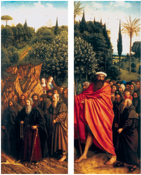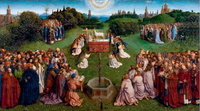 100 Фромантен. С. 262–264. Начиная по крайней мере с XVI в. сцена поклонения агнцу давала название всему «Гентскому алтарю». Сюжет ее заимствован из Апокалипсиса: «Взглянул я, и вот, великое множество людей, которых никто не мог перечесть, из всех племен и колен, и народов и языков стояло пред престолом и пред Агнцем» (Откр. 7: 9). Вся композиция открытого алтаря объединяется темой непрекращающейся литургии, которая совершается в Небесном Иерусалиме; поэтому Бог Отец представлен в облачении священнослужителя (Brand Philip L. The Ghent Altarpiece and the art of Jan van Eyck. Princeton, 1971. P. 61). Вероятно, изображена литургия, совершаемая в праздник Всех Святых. Группа апостолов и представителей Церкви показана справа, а группа пророков и патриархов — слева, поскольку правая сторона является более значимой. Но вдали мужская группа движется к алтарю слева, а женская, символически менее значимая, — справа. Там отсчет правой и левой сторон ведется не с нашей точки зрения, а с точки зрения Бога — нашего имплицитного визави, который смотрит изнутри изображения. Следовательно, в «Поклонении агнцу» соединены две перспективы — человеческая и Божественная (Успенский. С. 307, 314). Невидимая грань, на которой они смыкаются, проходит по престолу. Находясь на этой границе, агнец соответствует двум природам Христа — Божественной и человеческой. Последовательно проведенное ван Эйком противопоставление Божественного и человеческого — важный аргумент против попыток многих современных ученых толковать его творчество как проявление пантеистического мировоззрения.