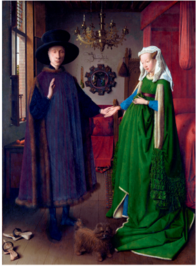 Для их земной жизни обет взаимной верности был важнее венчания в церкви. Обряд, который мог совершаться без священника, требовал произнесения женихом и невестой слов торжественного обета, в подтверждение которого жених поднимал руку. «Иоханнес де Эйк был здесь 1434» — начертано на стене комнаты. Стало быть, перед нами не просто первый в истории станковой живописи супружеский портрет, но и свидетельство о браке за подписью художника. Ван Эйка вместе с другим свидетелем можно разглядеть в проеме двери, отраженном в выпуклом зеркале [120].