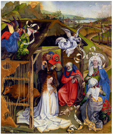 «Рождество» из Музея изящных искусств в Дижоне, которое относят к ранним, доэйковским работам Робера Кампена, — довольно крупная по тем временам картина [21]. Все в этом произведении необычно для тех, кто знает, как изображали Рождество до Кампена.