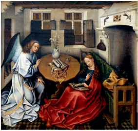 Мария, изумленно всплеснув руками, замерла на коленях перед «великим царем Израиля». Кампен был едва ли не первым, кто изобразил ее так, какою увидела ее святая Бригитта: «Когда пришло время ей родить... она опустилась на колени и стала молиться. Пока она так молилась, воздев руки, Младенец неожиданно родился в таком ярком сиянии, что оно полностью поглотило слабый свет свечи Иосифа» [24].