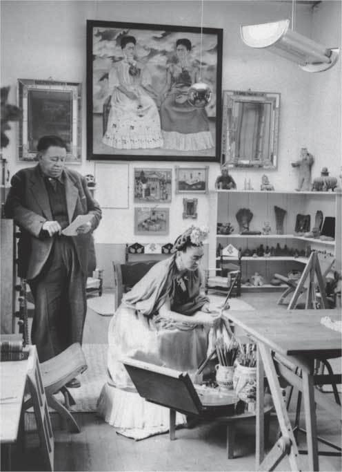 Фрида Кало в своей студии с Диего Риверой. Фотография сделана приблизительно в 1945 г. На заднем плане картина «Две Фриды», написанная в 1939 г.