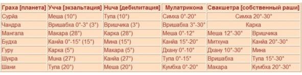 3: 49—50. ЭКЗАЛЬТАЦИЯ И ДЕБИЛИТАЦИЯ ПЛАНЕТ: Меша [Овен], Вришабха [Телец], Макара [Козерог], Канйа [Дева], Карка [Рак], Мина [Рыбы] и Тула [Весы] считаются соответственно раши [знаками] экзальтации семи грах — Сурйи и остальных. Градусы максимальной экзальтации этих грах соответственно равны 10, 3, 28, 15, 5, 27 и 20. А в седьмом раши от упомянутого раши экзальтации каждая граха находится в своей дебилитации (максимальный градус такой же).