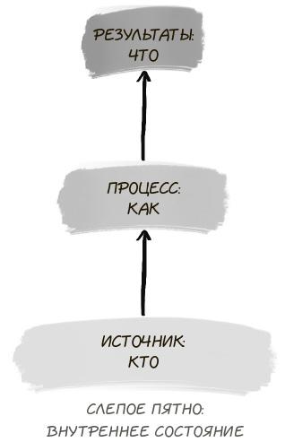Существует слепое пятно лидерства, управления и социальных перемен. Также оно относится к повседневному опыту общественного взаимодействия. Это — место внутри, источник, из которого мы действуем, когда общаемся, воспринимаем или думаем. Мы видим, что делаем (результаты). Понимаем, как делаем (процесс). Но обычно ничего не знаем о том, кто делает: внутреннее пространство, или источник, из которого проистекает наше действие (см. рис. 2).