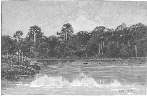 Along the track of the Manyuema it was easy to travel. Sometimes we came to a maze of roads; but once the general direction was found, there was no difficulty to point to the right one. It appeared to be well travelled, and it was clearer every mile that we were approaching a populous settlement. As recent tracks became more numerous, the bush seemed more broken into, with many a halt and many wayward strayings. Here and there trees had been lopped of their branches. Cording vines lay frequently on the track; pads for native carriers had often been dropped in haste. Most of the morning was expended in crossing a score of lazy, oozy rillets, which caused large breadths of slime-covered swamp. Wasps attacked the column at one crossing, and stung a man into high fever, and being in such an emaciated condition there was little chance of his recovery. After a march of seven miles south-eastwardly we halted on the afternoon of the 17th.
