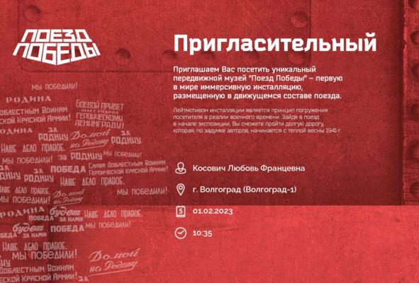 Искреннейшая благодарность сотрудникам некоммерческой организации социального обслуживания населения «Опора»: Галине Александровне Булгаковой, Эльвире Петровне Шитовой, Марине Владимировне Пчелиной, Дмитрию Михайловичу Сотникову, Геннадию Геннадьевичу Иванову, — за возможность посетить иммерсивный музей с историко-художественной экспозицией «Поезд Победы», организованный художниками творческой мастерской «Невский баталист», медиогруппой «Красный квадрат», движением «Волонтёры Победы», народным фронтом «Молодёжка ОНФ», и по материалам Интернета, впечатлениям написать рифмованный текст.