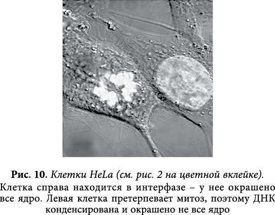 Поэтому до сих пор мир рождается и множится точно так же. Это можно увидеть на фотографии деления хромосом в фазе митоза (рис. 10). «Большой взрыв» виден в левой клетке, претерпевающей митоз.