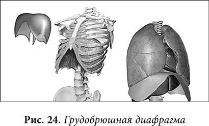 Магнит человека собран из множества маленьких магнитиков — диполей. Главной нейтральной зоной становится середина магнита, в отношении человека — середина позвоночника. Это зона солнечного сплетения, от которой вверх идет «крона» — верхняя половина тела и голова, а вниз «корни» — ноги. Материальное тело в этой области разделяет грудобрюшная диафрагма (ГБД) (рис. 24).