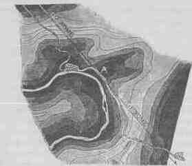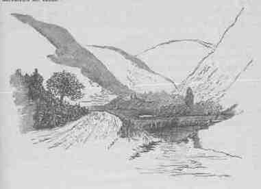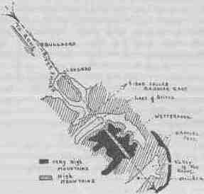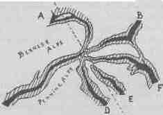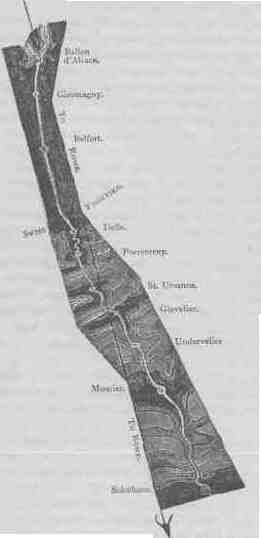 where the dotted line points exactly to Rome. There are two bends which take one a little out of one's way, and these bends I attempted to avoid, but in general, the valley, about a hundred miles from Toul to the source, is an evident gate for any one walking from this part of Lorraine into Italy. And this map is also useful to show what route I followed for my first three days past Epinal and Remiremont up to the source of the river, and up over the great hill, the Ballon d'Alsace. I show the river valley like a trench, and the hills above it shaded, till the mountainous upper part, the Vosges, is put in black. I chose the decline of the day for setting out, because of the great heat a little before noon and four hours after it. Remembering this, I planned to walk at night and in the mornings and evenings, but how this design turned out you shall hear in a moment.