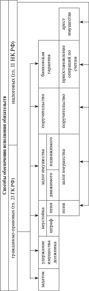 Как видно из представленной на рисунке схемы, согласно ГК РФ и НК РФ ипотека может служить обеспечением как налоговых, так и неналоговых обязательств. Наряду с ипотекой обязательства обоих видов могут обеспечиваться посредством залога движимого имущества, поручительства, банковской гарантии, начисления пеней. Обеспечения, характерные только для гражданско-правовых обязательств, — это штраф, удержание имущества должника, задаток. Специфическими обеспечениями налоговых обязательств выступают приостановление операций по счетам и арест имущества налогоплательщика.