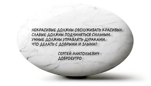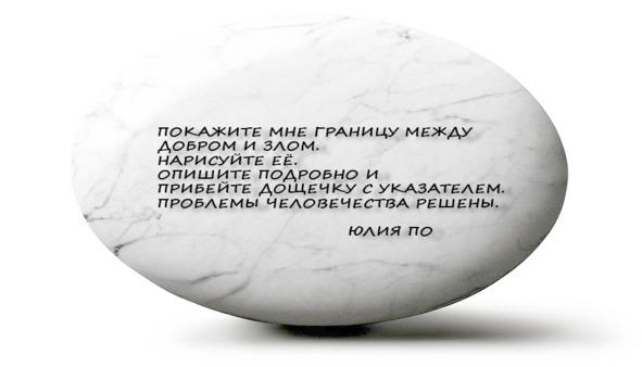 А мы плавно переходим к содержанию, к белым камням — фразам, брошенным в этот мир, к кругам на воде — историям, которые родились под влиянием брошенных фраз.