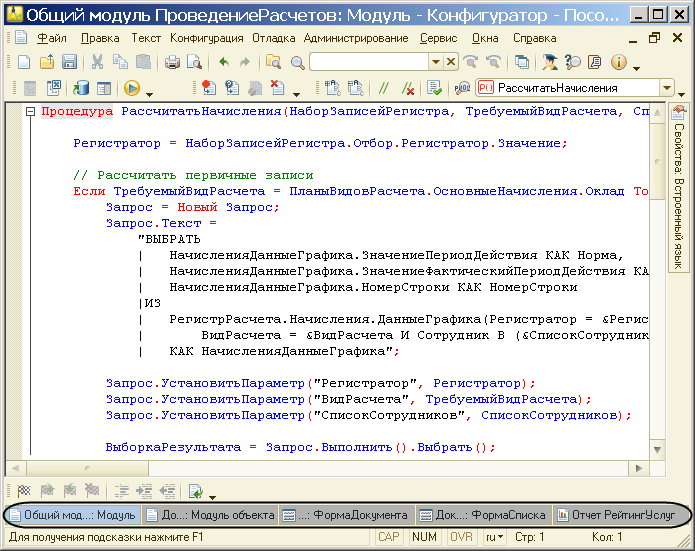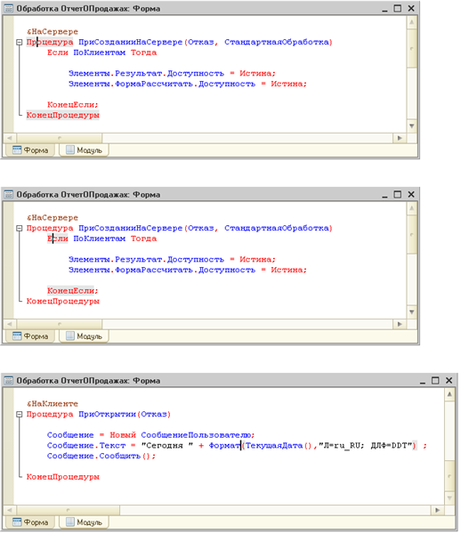 Для того чтобы не допустить такую ошибку или, если уж она случилась, помочь исправить ее, в конфигураторе есть специальные средства. Они позволяют выделять цветом границы блока (начало и конец процедуры, начало и конец цикла, начала и конец условного перехода, парные скобки) в тексте модуля.