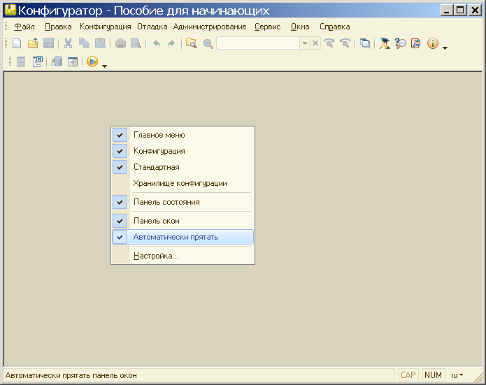 Для экономии пространства панель окон можно сделать прячущейся. Этим свойством, как и вообще отображением панели окон, можно управлять из контекстного меню, вызываемого на свободной области конфигуратора. Для того чтобы панель окон отображалась в конфигураторе, но была прячущейся, в контекстном меню рабочей области конфигуратора установите флажки Панель окон и Автоматически прятать (рис. 2).