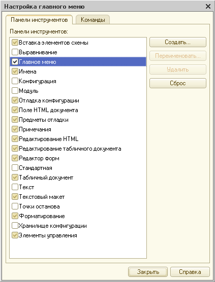 Рис. 4. Настройка видимости панелей инструментов конфигуратора