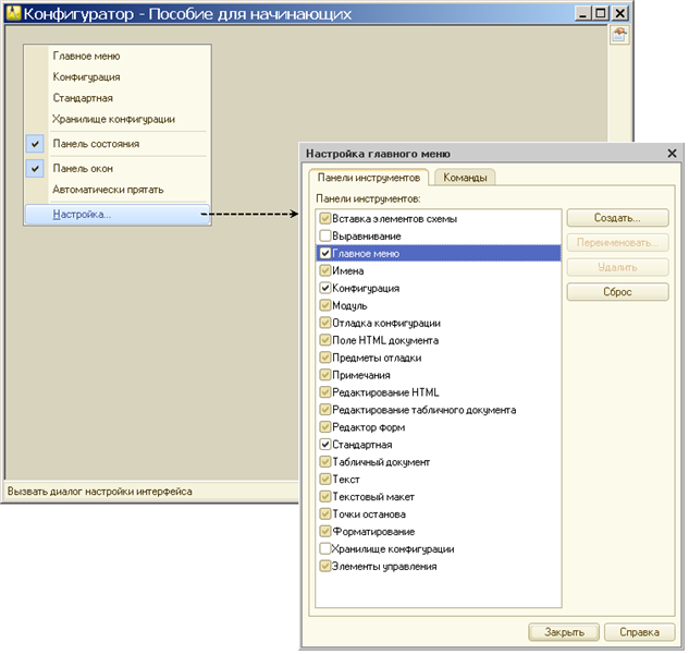 Если же вы отключили случайно все панели, включая главное меню, то так работать вы не сможете. Чтобы включить главное меню (и/или другие панели конфигуратора), закройте все открытые окна конфигуратора комбинацией клавиш Ctrl + F4, на пустой рабочей области вызовите контекстное меню и выполните пункт меню Настройка (рис. 5).