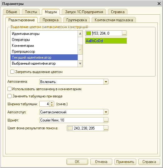 Если по какой-то причине подсветка парных синтаксических конструкций у вас отключена, то включить ее можно в параметрах конфигуратора: Сервис > Параметры > Модули > Редактирование, окно Выделение цветом синтаксических конструкций > Границы блока. Там же вы можете восстановить стандартное выделение и других элементов. Например, обычно ключевые слова выделяются красным цветом текста, идентификаторы – синим, комментарии – зеленым и т. д.