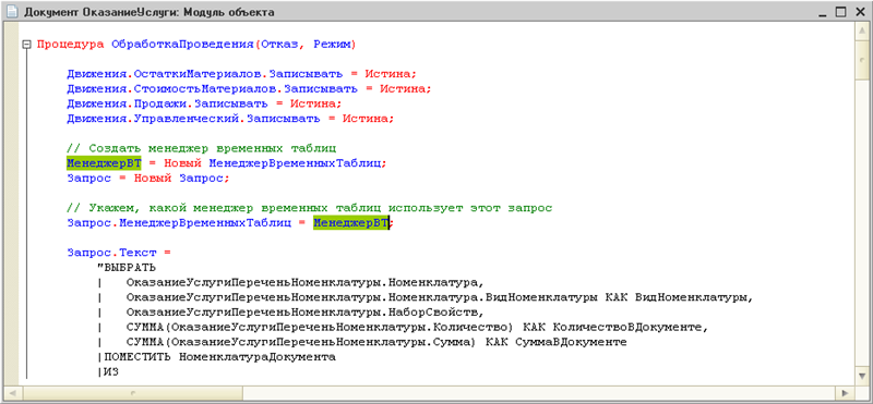 Теперь, например, в обработке проведения документа создайте менеджер временных таблиц и сохраните его в переменной МенеджерВТ. Ниже в тексте модуля используйте эту переменную еще раз. Если вы написали имя переменной правильно, то переменная, написанная выше, будет подсвечена зеленым цветом так же, как и ваша текущая переменная (рис. 8).